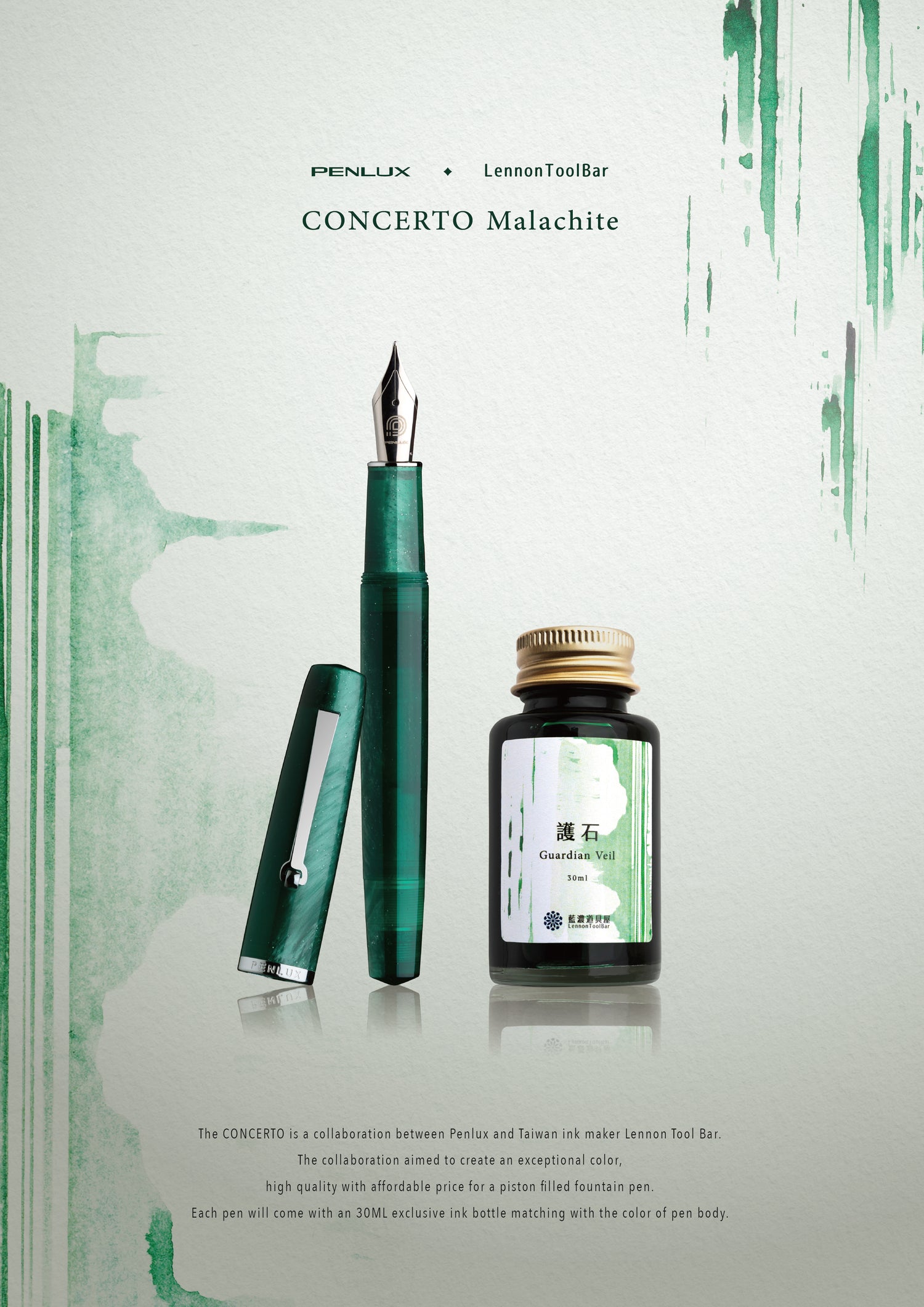 Announcing the fourth edition in the highly successful Penlux Concerto series: the Penlux Concerto Malachite. This latest installment continues the tradition of excellence through a special collaboration with the renowned Taiwanese ink maker, Lennon Tool Bar. While Penlux has meticulously crafted the fountain pen to exacting standards, Lennon Tool Bar has lent their expertise to create a custom ink that perfectly complements this release.