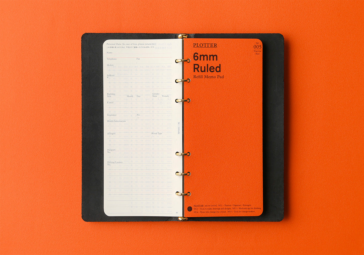 Note: The backplate is made of brass and plated with gold color. Plating may come off due to friction and will exhibit the natural oxidation and discoloration of the brass material. Please enjoy the natural aging of the brass characteristic alongside the leather. We recommend inserting no more than 80 pages of PLOTTER original DP refill paper to ensure the longevity and functionality of the hardware.