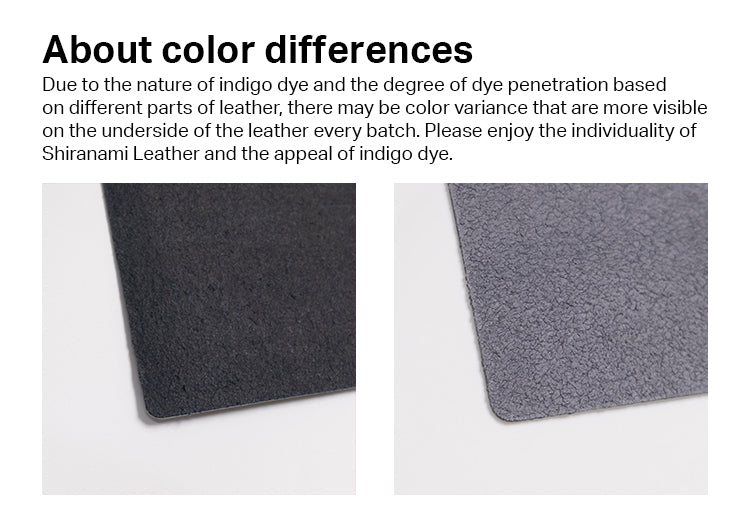 The edge of Shiranami leather is untreated so you can see the gradation of which the indigo dye penetrates the pale material of undyed leather. This is a unique expression that we preserve as a homage to the process of “Aizome” (indigo dye).