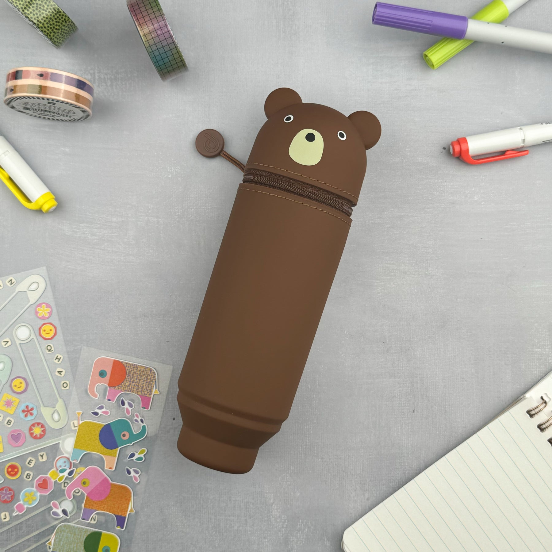 PuniLabo Stand Up Pen Cases are the perfect companion for any stationery lover! Each case can be zipped closed for easy transportation, and holds your favorite pens and pencils upright until you're ready to use them. Simply place your writing supplies in the body, your eraser in the elastic on the top, and zip closed. When you want to use the contents, open the case, press the bottom down on the desk, and watch the case transform into a cup that pushes your writing supplies upward to make them easy to see and use.