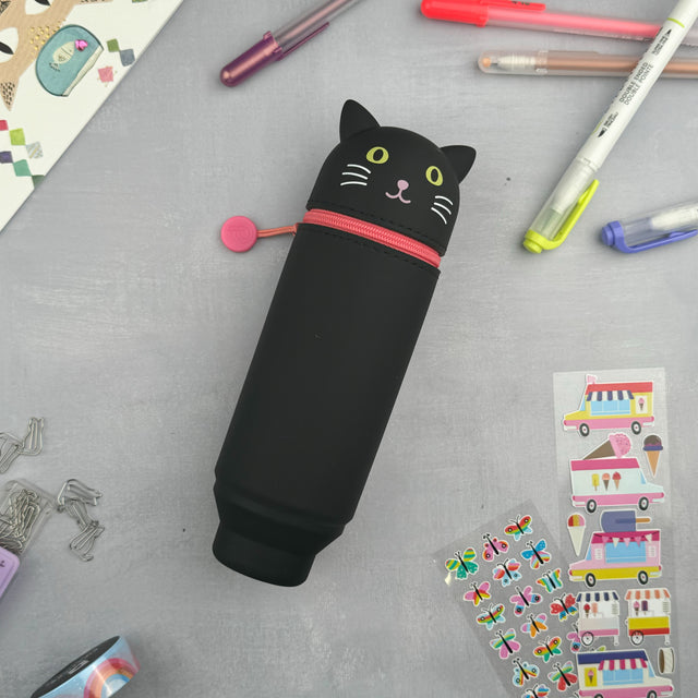 PuniLabo Stand Up Pen Cases are the perfect companion for any stationery lover! Each case can be zipped closed for easy transportation, and holds your favorite pens and pencils upright until you're ready to use them. Simply place your writing supplies in the body, your eraser in the elastic on the top, and zip closed. When you want to use the contents, open the case, press the bottom down on the desk, and watch the case transform into a cup that pushes your writing supplies upward to make them easy to see and use.