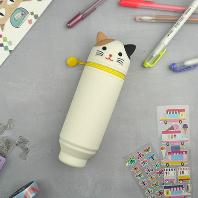 PuniLabo Stand Up Pen Cases are the perfect companion for any stationery lover! Each case can be zipped closed for easy transportation, and holds your favorite pens and pencils upright until you're ready to use them. Simply place your writing supplies in the body, your eraser in the elastic on the top, and zip closed. When you want to use the contents, open the case, press the bottom down on the desk, and watch the case transform into a cup that pushes your writing supplies upward to make them easy to see and use.