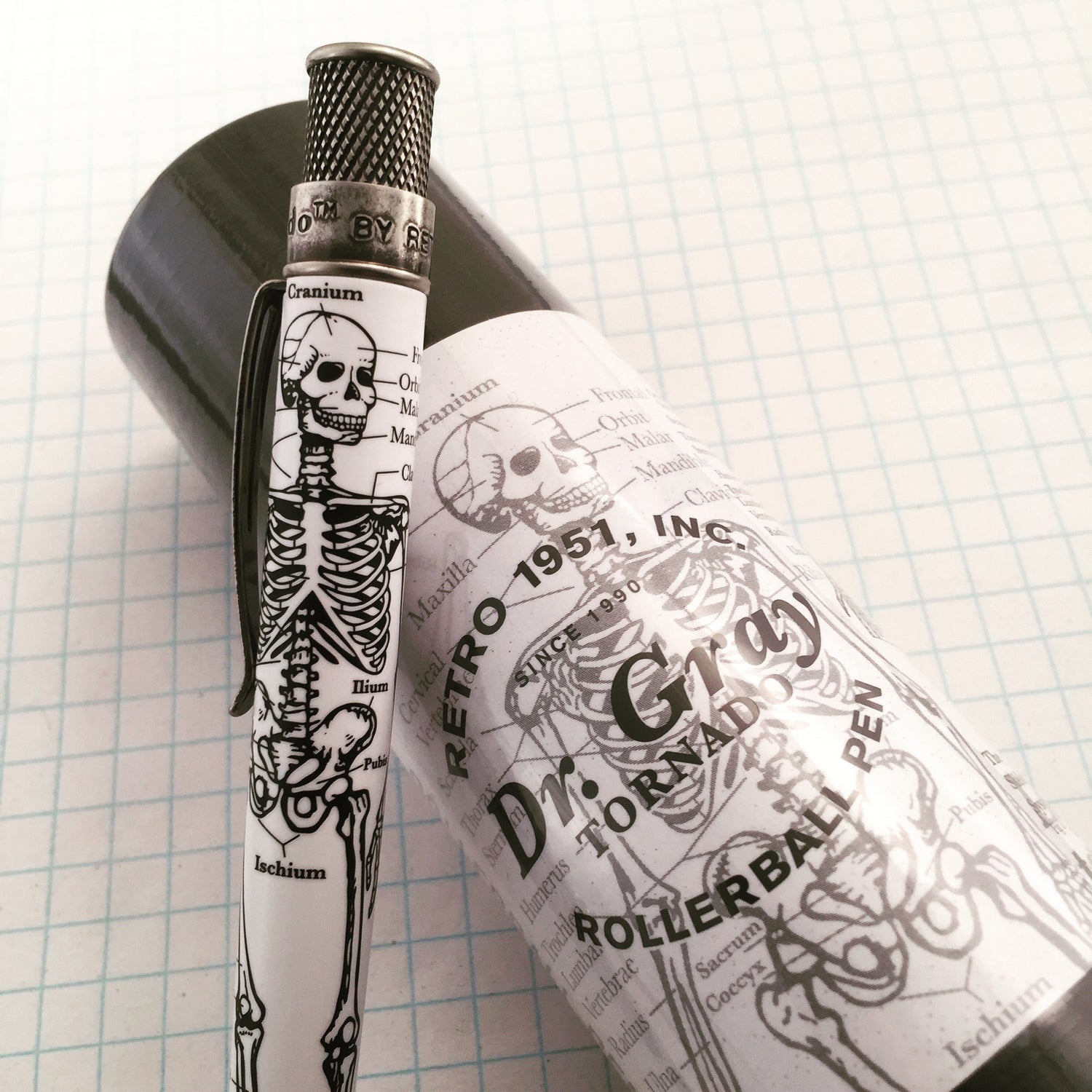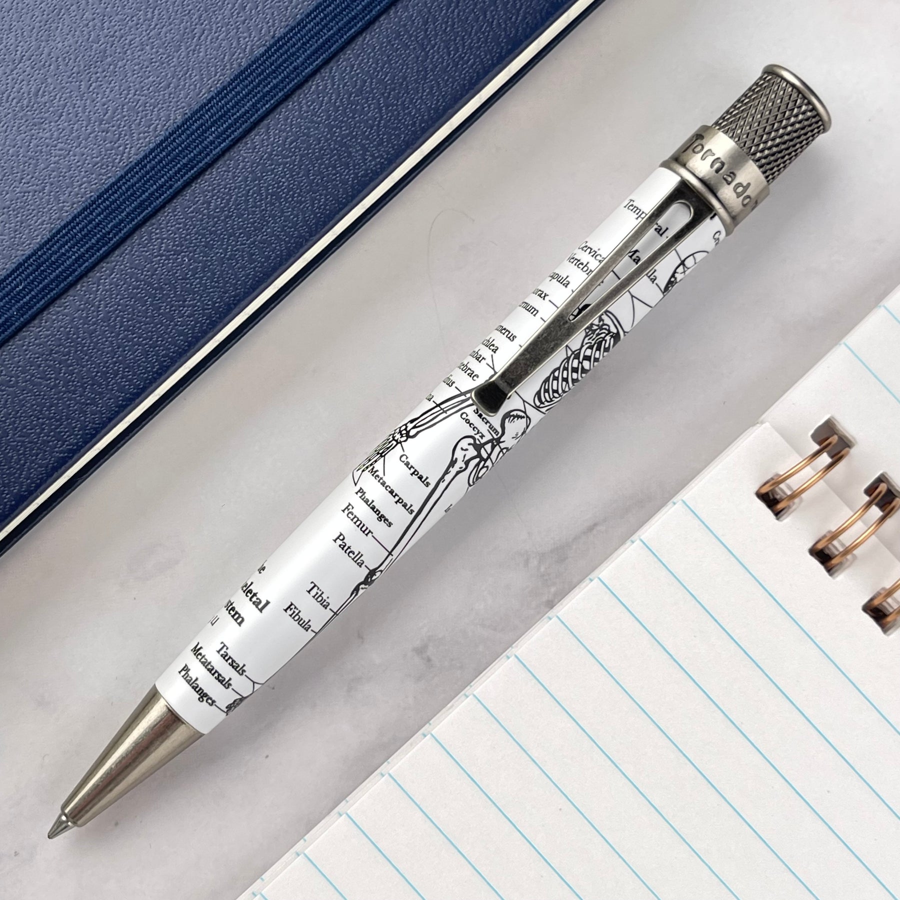 Retro 51 Vintage Metalsmith Tornado is a capless rollerball with a twist mechanism. GID barrel with skeleton print & stonewash trim.