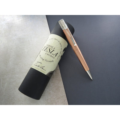 Futurist, inventor, electrical and mechanical engineer, Nikola Tesla was a genius well ahead of his time. His inventions are still being used to this day and his theories were so advanced that they continue to be studied, experimented on and even power the modern world. This Tornado's design was inspired by Tesla's spiral coil used in his wireless power experiments. Concentric circles are acid-etched into the barrel then plated in copper and finished with platinum appointments giving it a radiant and magnetic aesthetic. Each rollerball is loaded into a commemorative packaging tube that doubles as a pen stand when not in use. Pick up this new Tornado and rub shoulders with genius.