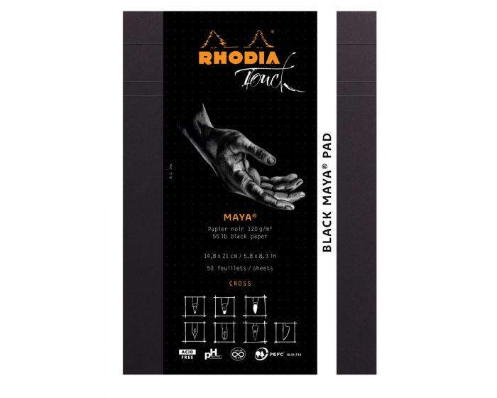 This deep dyed cellulose-based 55 lb black Maya® paper is perfectly smooth on both sides. It is particularly well suited for detailed pencil, felt tip, graph liner and nib drawings. Its highly resistant surface allows ink to dry rapidly and will also withstand repeated scratching and erasing without pilling. This paper is acid-free and PH-neutral. Vegan friendly.