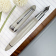 The 1911L Themis is finished in a beautiful gray color that radiates a modern, casual feel while maintaining a refined look. The pen features a well-balanced, black IP-finished metal grip section that enhances the writing experience by providing a satisfying weight and allowing for smoother strokes without the need for excessive pressure, making it ideal for extended writing sessions. Additionally, this model showcases Sailor’s unique 21K solid gold nib, finished with black IP.