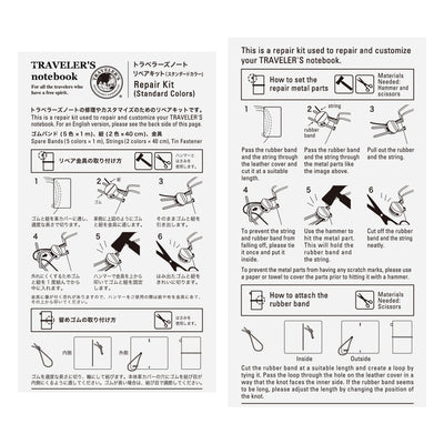 It comes with comes with a tin based charm, 5 sets of bands, and 2 stings to use as bookmarks. If the band on your TRAVELER’S notebook gets cut or loosened, please use this to repair. TRAVELER’S notebook is made to be simple to fix and customize. We hope you will treasure and maintain notebook for many, many years.