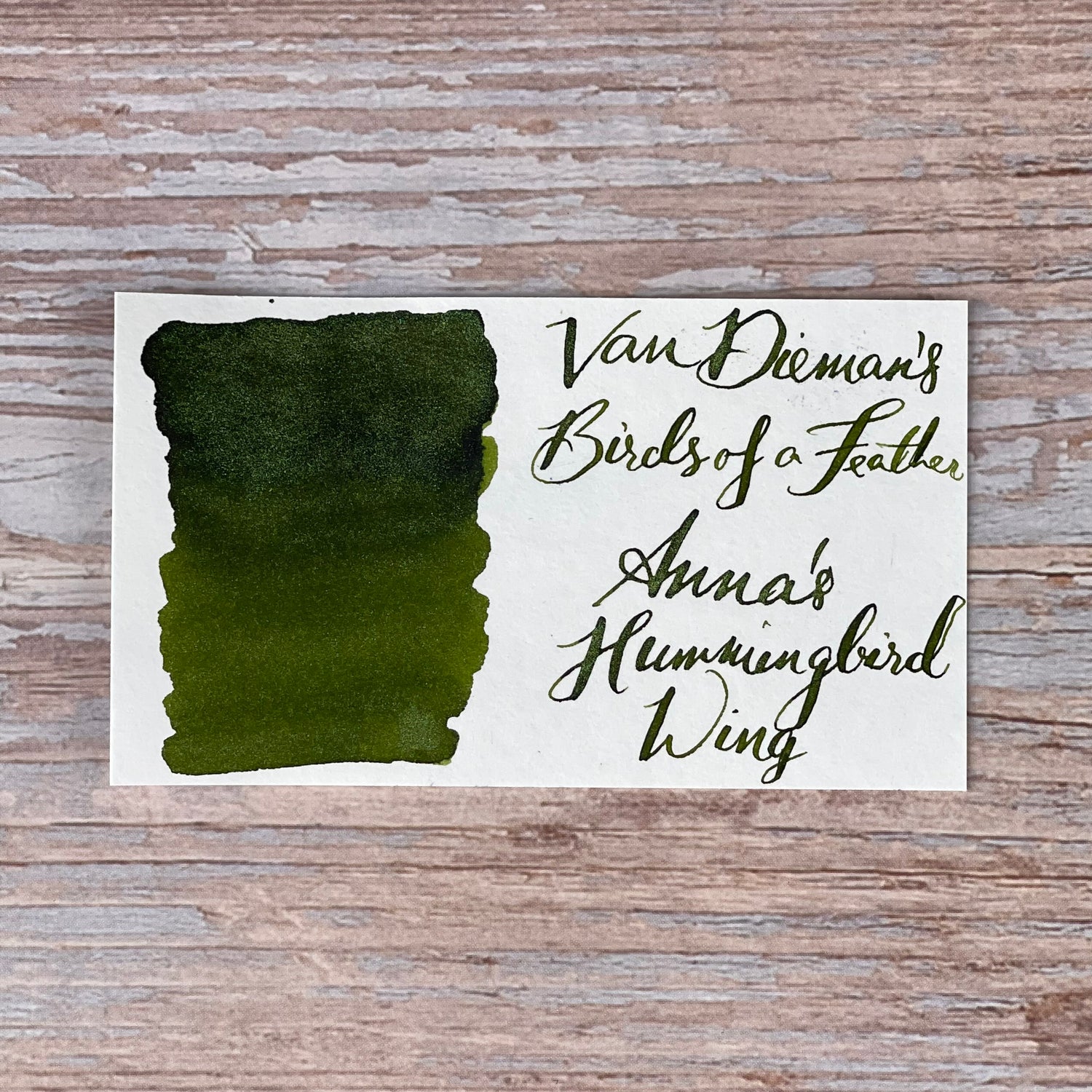 Introducing Anna's Hummingbird - Wing, from the Birds of a Feather collection of fountain pen inks by Van Dieman's Ink. This ink is a shimmering tribute to the unique and stunning Anna's Hummingbird. Known for its iridescent plumage and quick flight, this bird is a true marvel of nature.