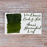 Anna's Hummingbird - Wing ink is a mossy lily pad green with iridescent gold, green and blue shimmer that catches the light and adds a touch of magic to your writing. It has a light to medium saturation, making it easy on the eyes and perfect for everyday writing. This ink also has a moderate shading effect, which means that the color will vary in intensity as you write, adding depth and interest to your letters.