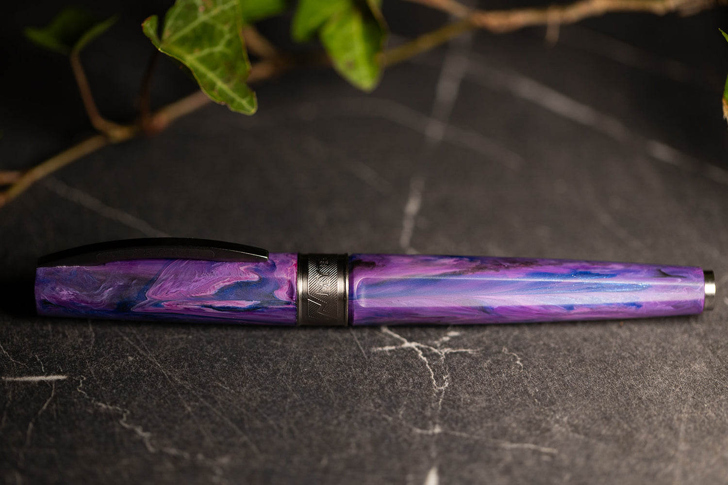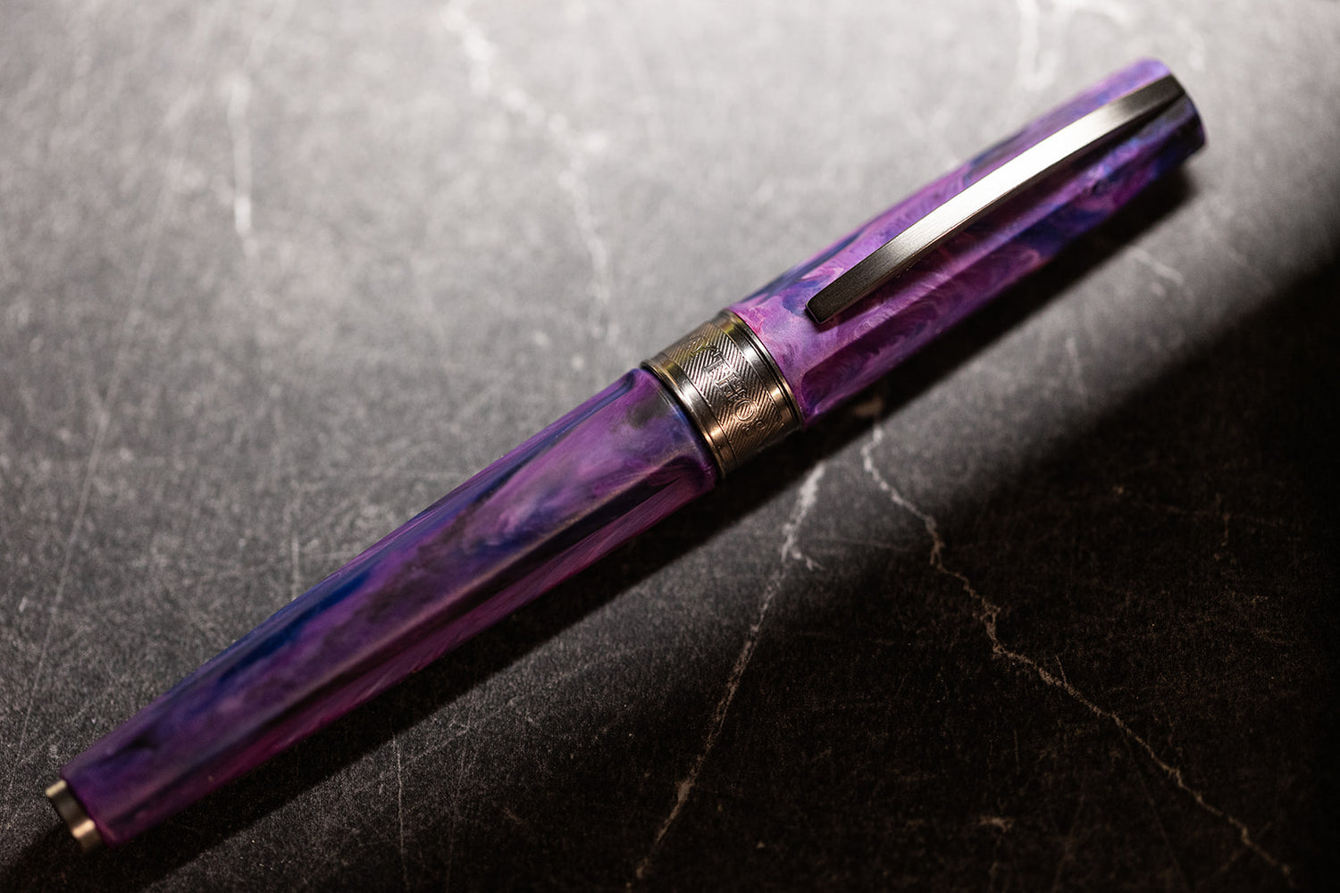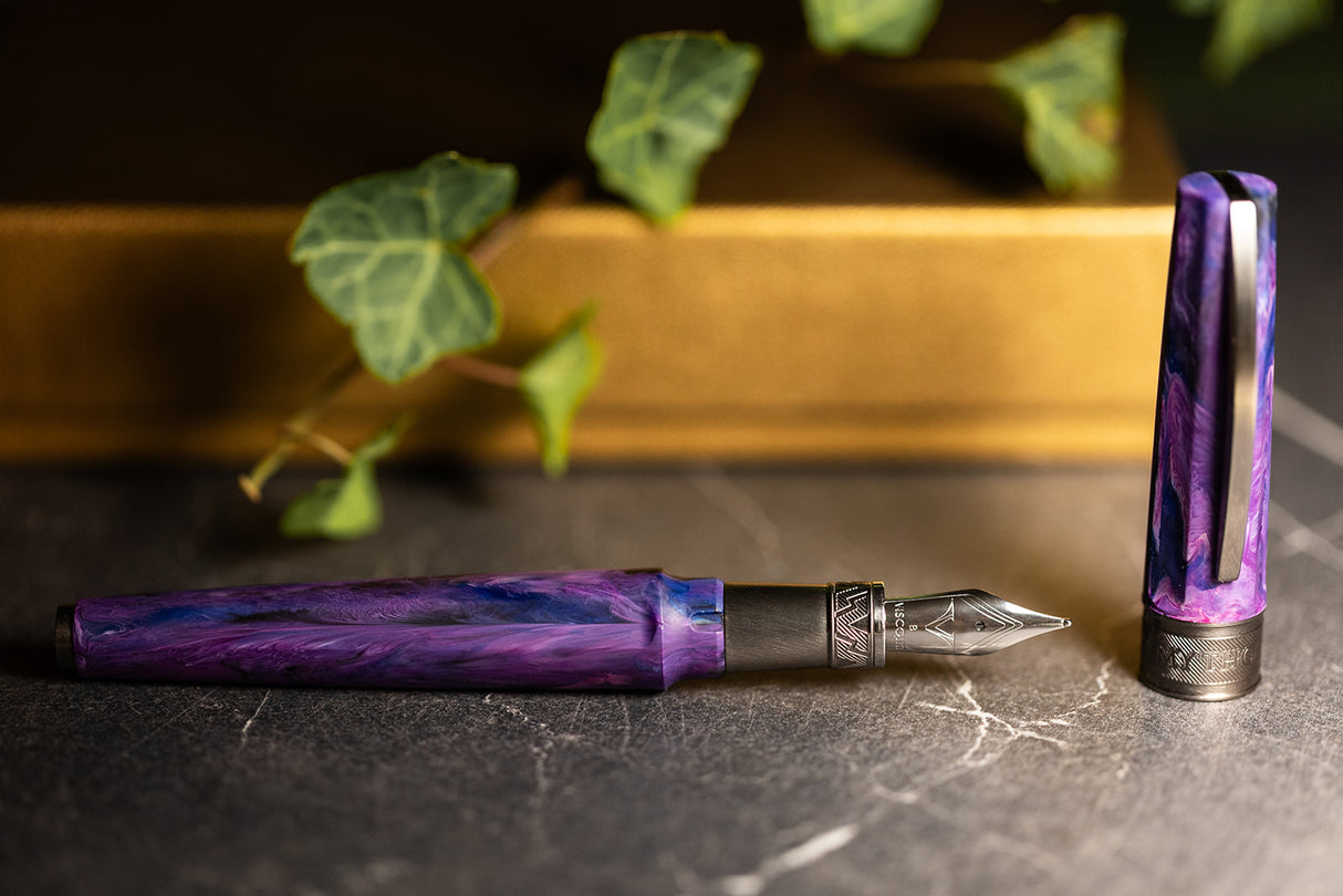 The Mythos collection is a tribute to the ancient Greek gods, who inspired art, literature and culture for centuries. Persephone, the enigmatic daughter of Demeter and queen of the underworld, represents duality and transformation - the eternal cycle of light and shadow. Her pen captures this mystique with a deep violet matte resin, interwoven with midnight blue undertones, invoking the quiet majesty of dusk and the silent promise of spring's return. The design conveys strength, poise, and the sovereignty of a goddess who reigns over the threshold between worlds.