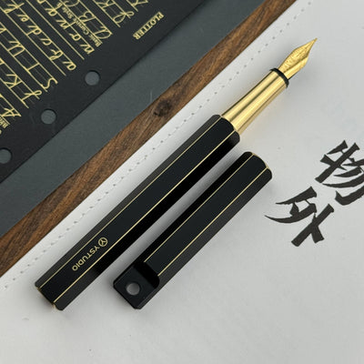 ystudio’s portable fountain pen creates a new way to bring your fountain pen with you. You can hang it on your bag and open it to start writing. The pen writes steady and smooth. The nib is from Germany Schmidt nib and it comes with Schmidt converter inside. It’s a true eye catcher and a great gift suggestion. This pen is made of solid brass and has exquisite gold lines. It comes with one maple pen case (in black color) and one paper box package.